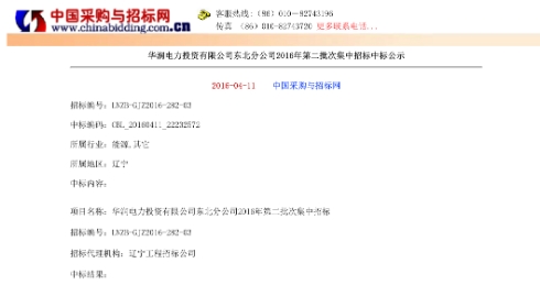 華潤電力2016年第二批次集中招標中一舉中標